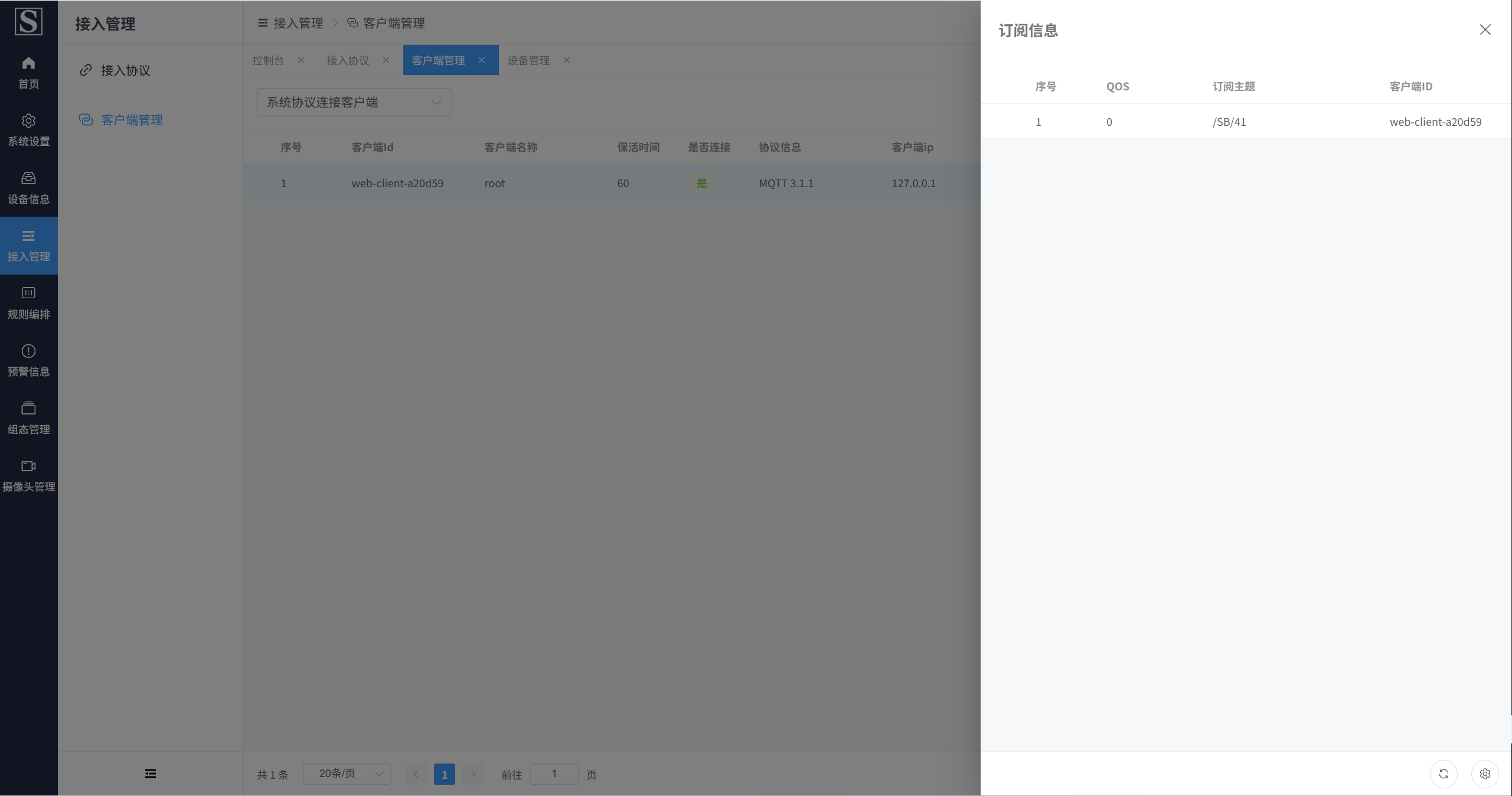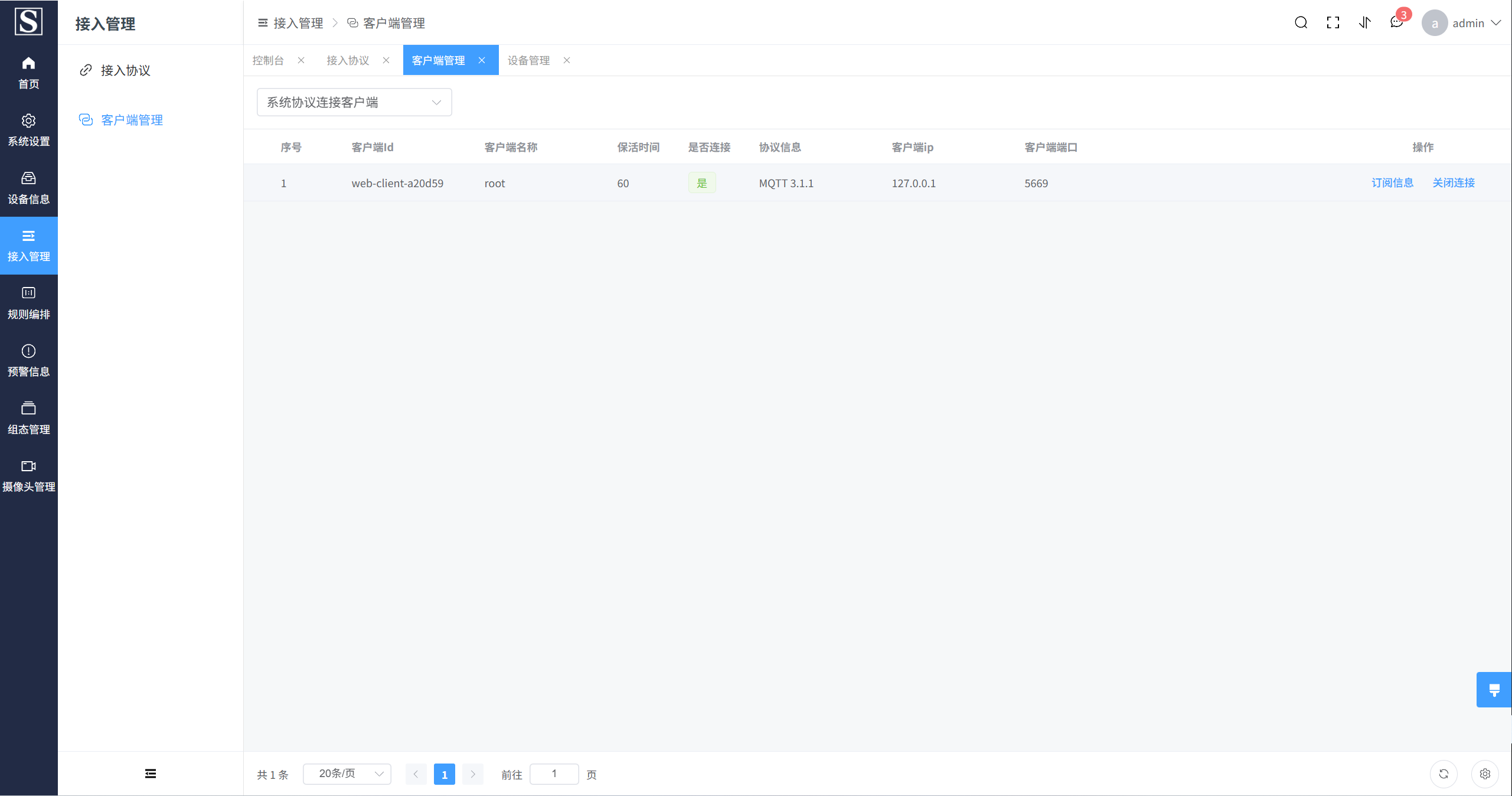 - 主要是对接入客户端进行管理,查看客户端信息,以及客户端订阅信息,也可以强制退出。